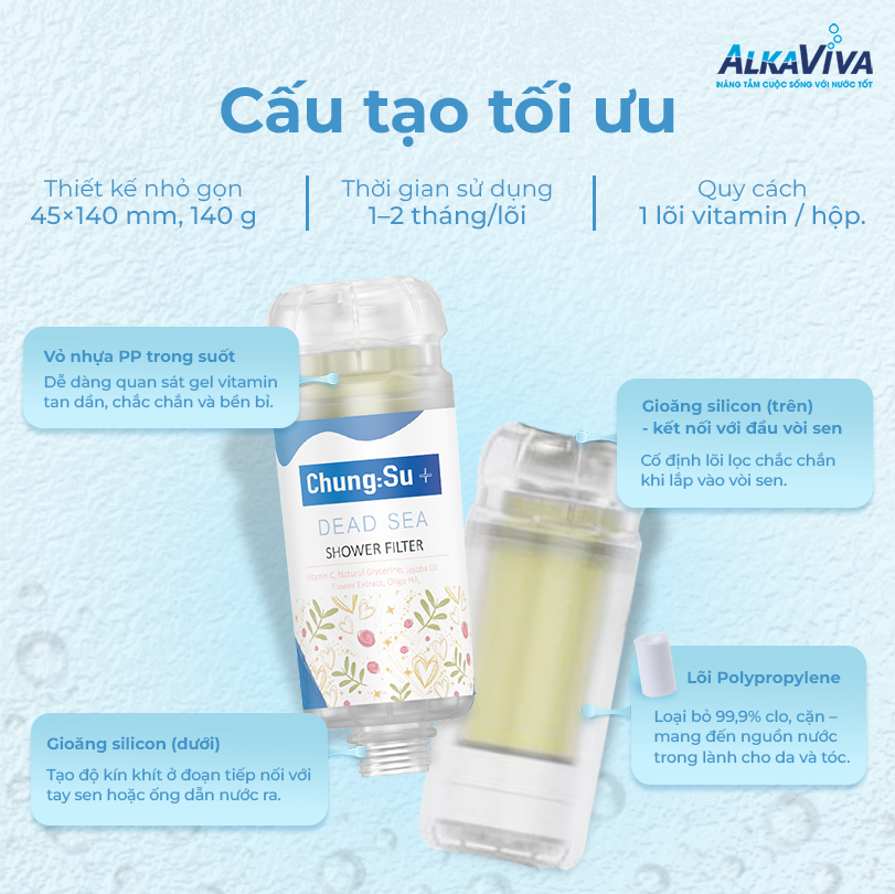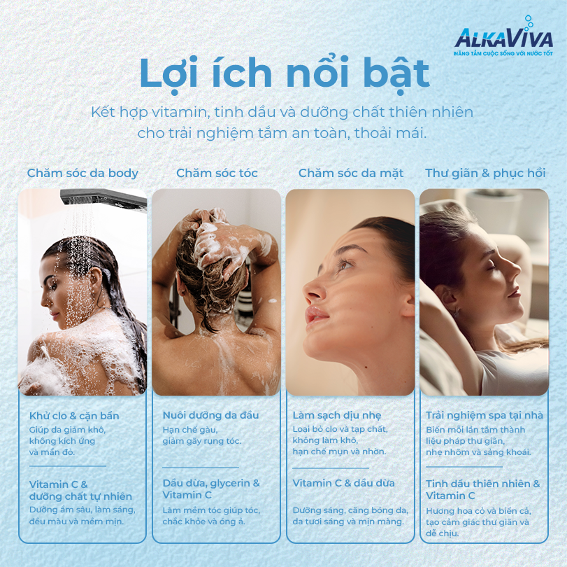 Nước ion kiềm giàu hydro AlkaViva bổ sung khoáng chất cần thiết như natri, kali, canxi, magie,… giúp da sáng khỏe, tiêu hóa tốt, xương chắc và giảm căng thẳng. Nước giàu hydrogen có khả năng chống oxy hóa cao, hỗ trợ làm chậm lão hóa, cải thiện giấc ngủ và sức khỏe toàn diện. Sản phẩm đạt chuẩn an toàn quốc tế, có độ pH 7.5-9.5, có hiệu quả hỗ trợ đối với tình trạng tăng tiết dạ dày axit, viêm loét dạ dày, trào ngược dạ dày thực quản, khó tiêu, viêm đại tràng, và phù hợp cho mọi lứa tuổi. Với các phân tử nước siêu nhỏ, sản phẩm giúp cơ thể hấp thụ tốt hơn, tăng cường sức khỏe tiêu hóa, xương, và phục hồi năng lượng sau vận động, mang lại cuộc sống khỏe mạnh và tràn đầy sức sống. Nước ion kiềm giàu hydro của Alkaviva có tác dụng như một loại thực phẩm bổ sung, thực phẩm dinh dưỡng sạch, an toàn, hỗ trợ một số nhóm bệnh chứ không phải thay thế thuốc chữa bệnh.