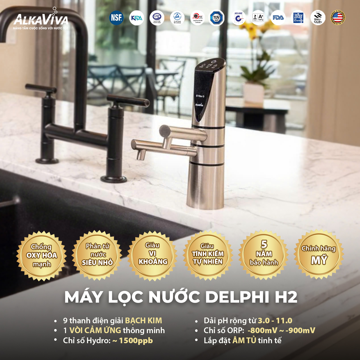 AlkaViva Delphi H2 là model cấp cao với thiết kế “Undersink” (gắn dưới bồn/chậu) hoặc tùy biến, dành cho người muốn giữ mặt bếp gọn và để thiết bị chìm. Máy cũng sử dụng 9 tấm Smart Electrodes, bộ lọc UltraWater và có khả năng tạo nước ion kiềm mạnh tương đương Vesta H2.